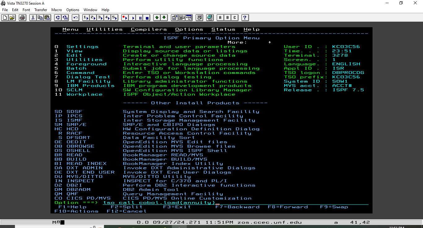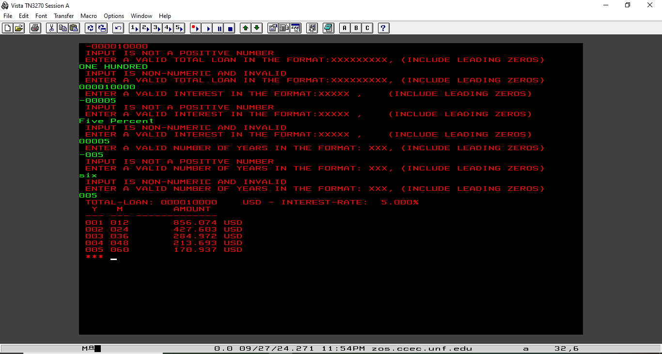 Reflection: This project was a lot tougher than the last one. Even though the initial code was provided, there were many things that needed to be changed/fixed. The first thing I had trouble with was getting the code to compile. For this I had to reference the spacing guide in the COBOL textbook. I learned that the Data division and procedure division need to follow a specific guideline (for example: no sentence can pass column 72 and must use a continuation line on the next line). I then needed to fix an issue with my annuity function looping infinitely. This was because I was using the wrong input format when accepting input and would print 500 years instead of 5 years causing an infinite loop. I also learned about paragraphs which allowed me to divide the processes taking place into manageable chunks (like methods in java). This included learning to use IF, ELSE and IS statements. Overall I needed help from multiple people and the IBM documentation.